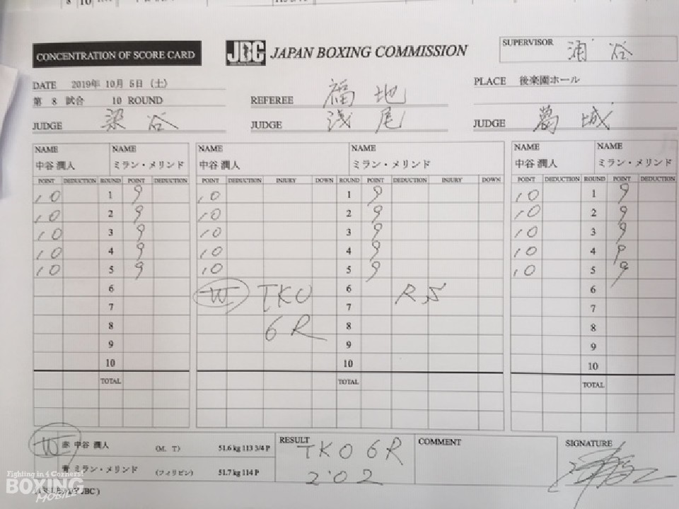 初回から中谷が身長差を活かしたジャブを突きペースを掌握。3回、中谷はジリジリと距離を詰めると冷静な攻撃でワンツー、左ボディストレートをヒットさせ、メリンドにつけ入る隙を与えなかった。4回、中谷は左ボディアッパーから多彩なコンビネーションを決めると、続く回も上下に打ち分けロープを背負わせた。6回、中谷は距離を詰め、ショート連打から緩急をつけた攻撃で攻め立てると、防戦一方となったメリンドを見てレフェリーが救い出した。中谷が元世界王者に圧勝し、無傷の20連勝を飾るとともに世界を猛アピールした。