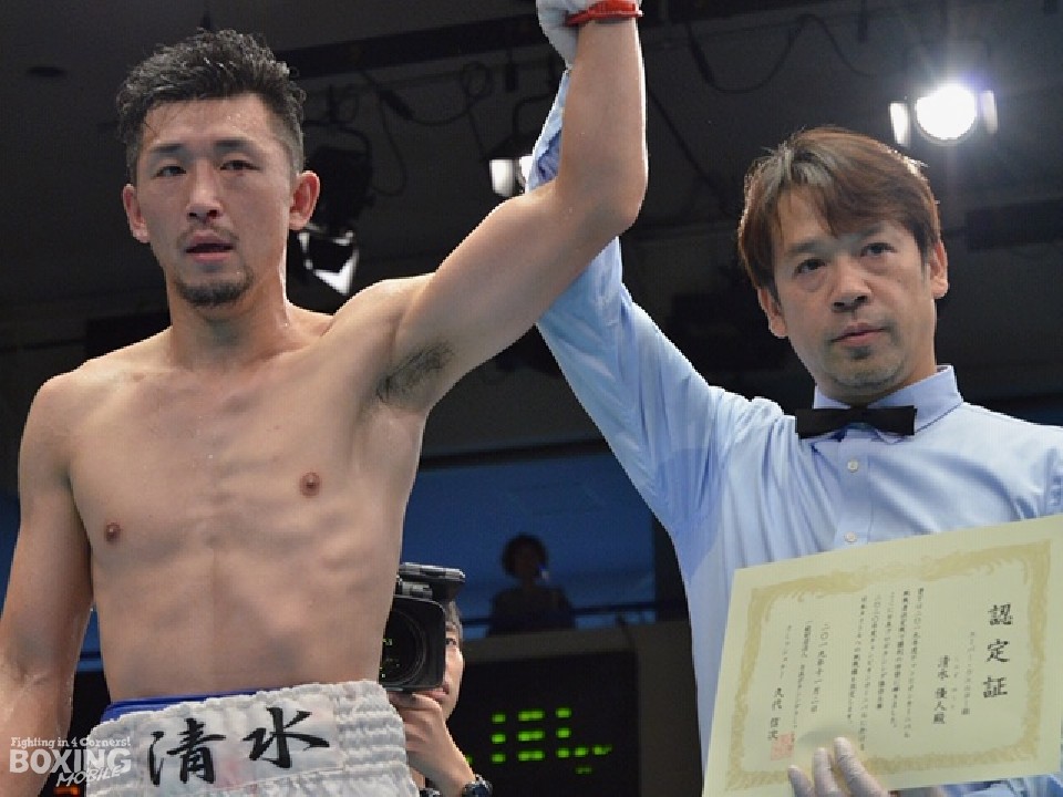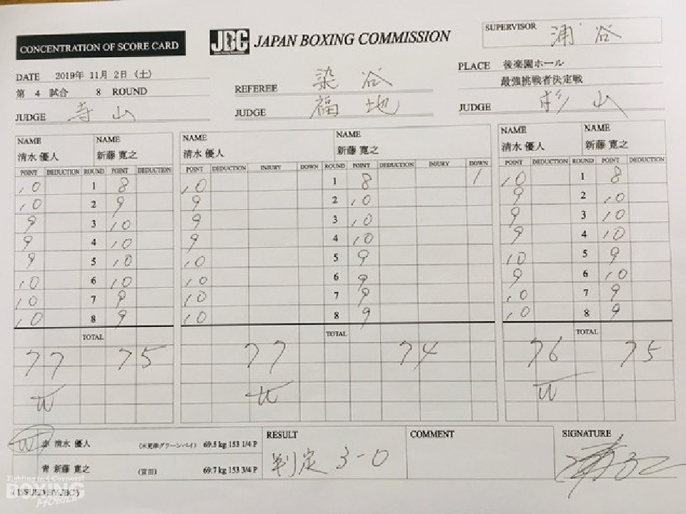 サウスポー新藤がワンツーを軸に攻め込むが、清水の右ストレートをボディにもらうとバランスを崩して尻もちをつき、レフェリーはダウンを宣告。2〜4回は新藤がタイミングの良い左ストレート、右フックを好打し失点を挽回したが、5回以降は清水が前に出てワンツーで顔を弾き見栄えの良さをアピールした。すると後半は手数が減った新藤を攻め立てポイントを連取した。