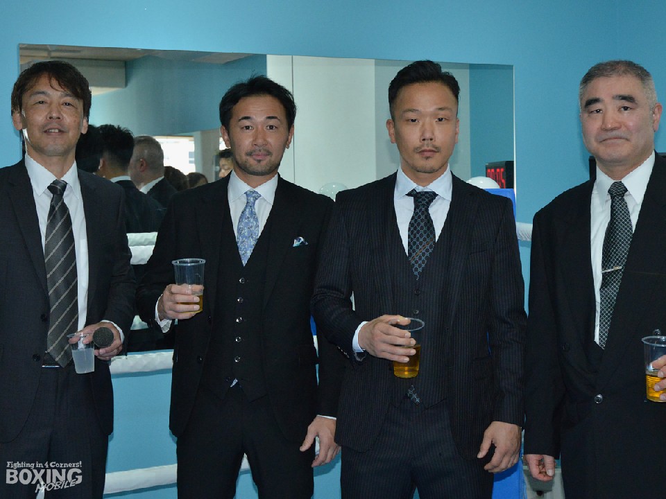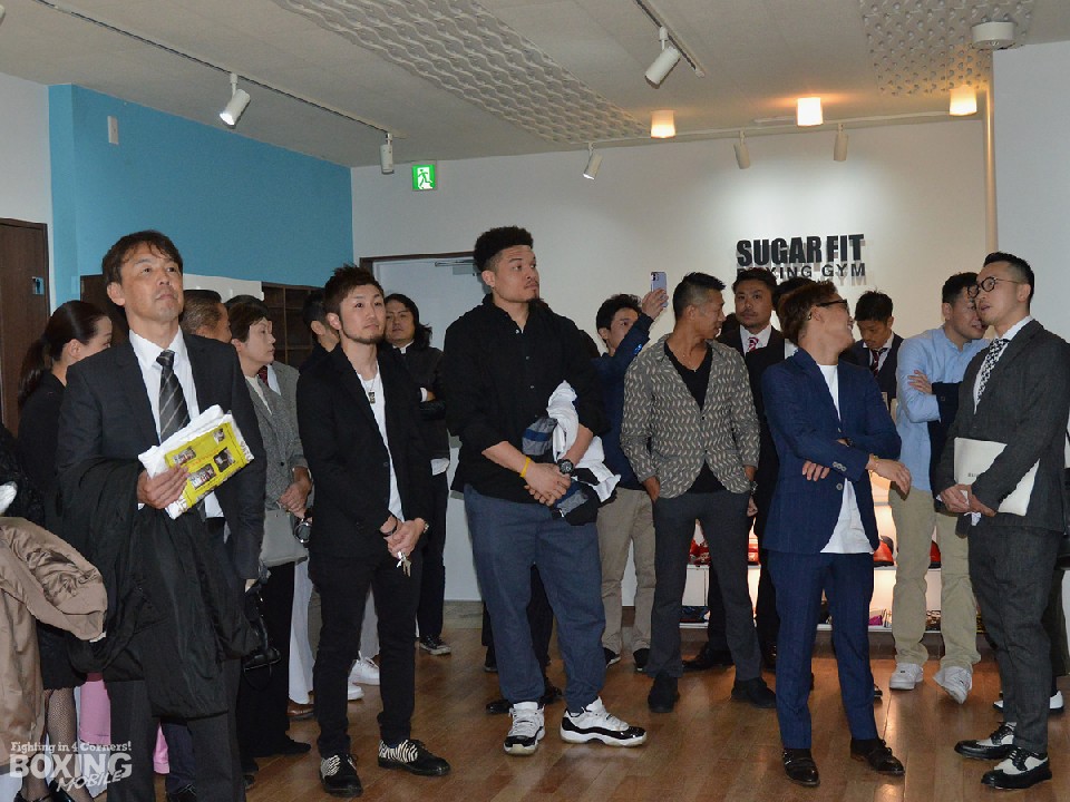 この日は帝拳プロモーション浜田剛史代表、下田氏を指導した葛西裕一氏、同門の元WBC世界バンタム級王者の山中慎介氏、元WBC世界ライトフライ級王者の木村悠氏、世界2階級制覇王者の粟生隆寛をはじめ、元WBA世界スーパーフェザー級スーパー王者の内山高志氏、現WBA世界ライトフライ級スーパー王者の京口紘人(ワタナベ)、前WBO世界スーパーフェザー級王者の伊藤雅雪(横浜光)と、ジムの垣根を越え多くの仲間が集結。下田氏の人脈の広さを窺わせた。