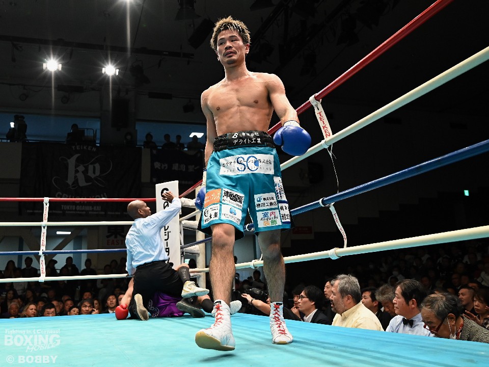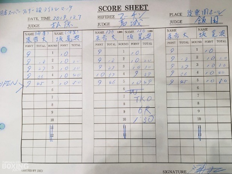 挑戦者の坂が開始からグイグイと距離を潰し先手を奪うことに成功。2回も左フックでのけぞらせるとワンツー連打で攻勢をかけた。ペースを握った坂は慌てずボディにパンチを集めて着実にダメージを与えた。前半終了時の公開採点は49-46×1、50-45×2で坂がリード。すると6回、坂が右アッパーから滅多打ちして痛烈なダウンを演出。レフェリーはノーカウントで試合を止めた。