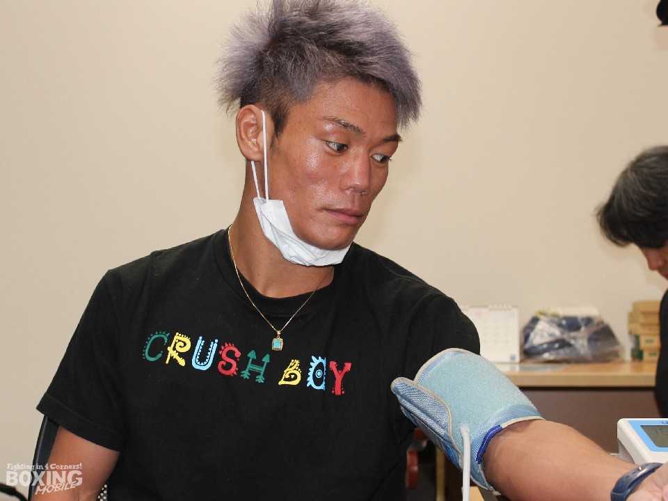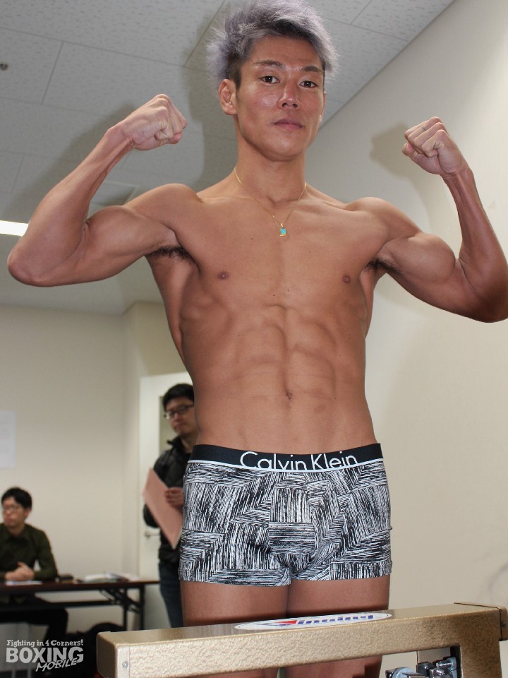 3度目の防衛戦に臨む勅使河原は100gアンダーの55.2kgでクリア。「体重の落ち方も練習量もこれまでで一番良い。怖いくらいに絶好調です」と調子の良さをアピールし、「相手の試合を見たが、華がなくパッとしない印象。明日は一方的に殴ってKOする」と自信たっぷりに言い放った。