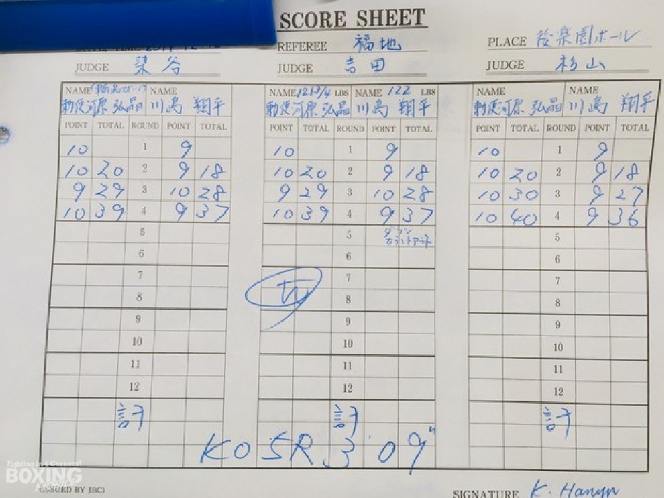 上体を柔らかく使う勅使河原はさらに変則的に前の手を伸ばし右クロスをヒット。挑戦者を後手にさせるが、川島も徐々に距離を掴むと王者の打ち終わりに左フックを合わせた。4回までの途中採点は39ー37、39ー37、40ー36で王者がリード。5回は川島のガードが機能し、勅使河原の打ち終わりに右ストレートを好打。チャンスを掴みかけたが、ここで強襲した勅使河原の左右と相撃ちとなり、終了1秒前に左フックでダウン。なんとか立ち上がった川島だが、ダメージは明らかでレフェリーがカウントを数え上げた。