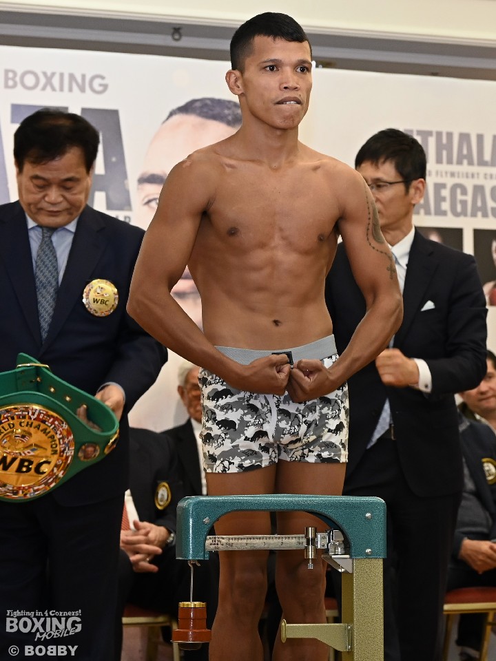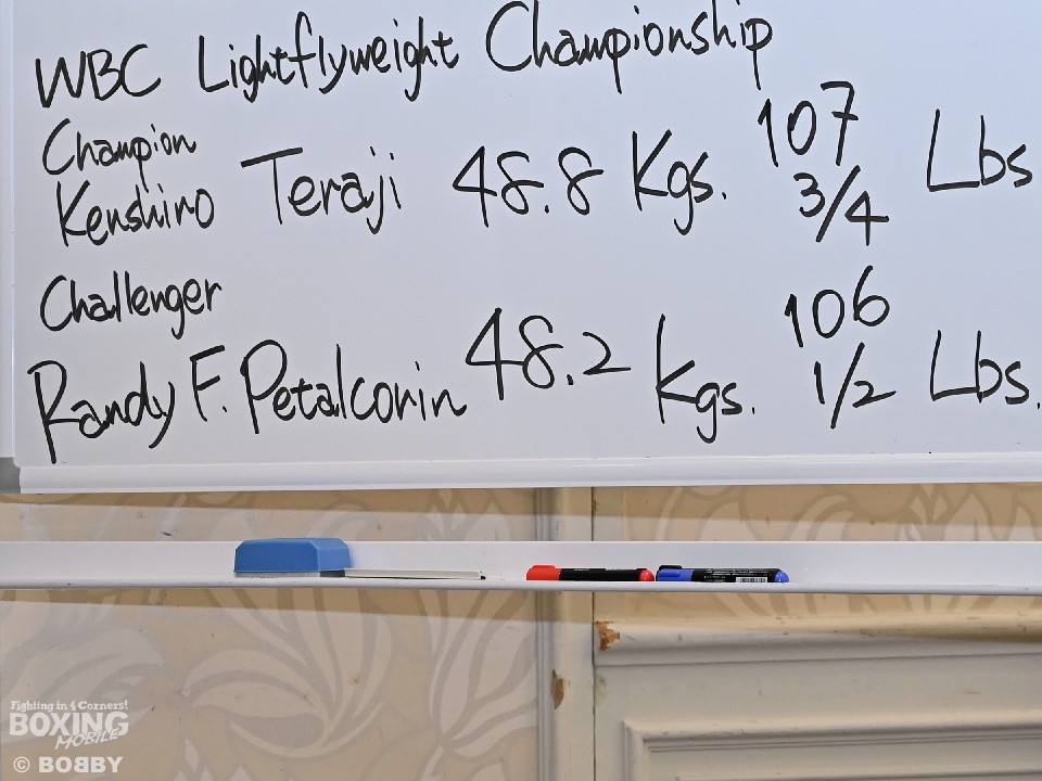 WBC(世界ボクシング評議会)ライトフライ級王者の寺地拳四朗(26=BMB)が22日、都内のホテルで前日計量に臨んだ。拳四朗は同級12位のランディ・ペタルコリン(27=比)を迎え、23日に横浜アリーナで開催される「FUJI BOXING」で日本人現役最多となる7度目の防衛戦に臨む。