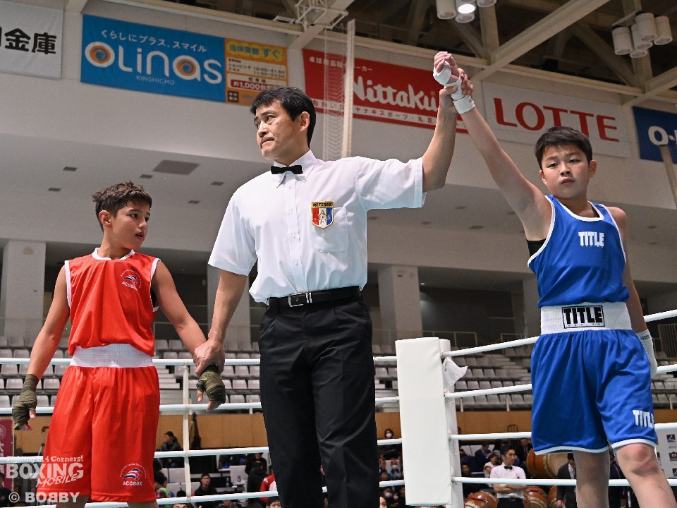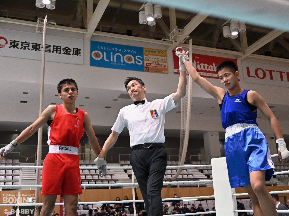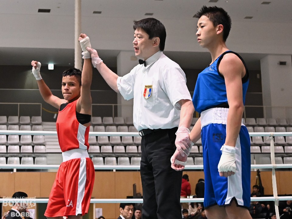 第四試合は、新井千喜(14=千葉)がディエゴ・ジェビエ・ミゲル・グアルダード (14=グアテマラ)にポイント勝ちした。試合後に笑顔で取材に応じた千喜は「くっついた時に力が強かった」と国際試合を振り返ったが、3ラウンドに奪ったスタンディングダウンに関しては「いつも練習している左ストレートが当たった」と日々の成果が出せたことを喜んだ。「オリンピックを目指したい」と将来の目標を語った。