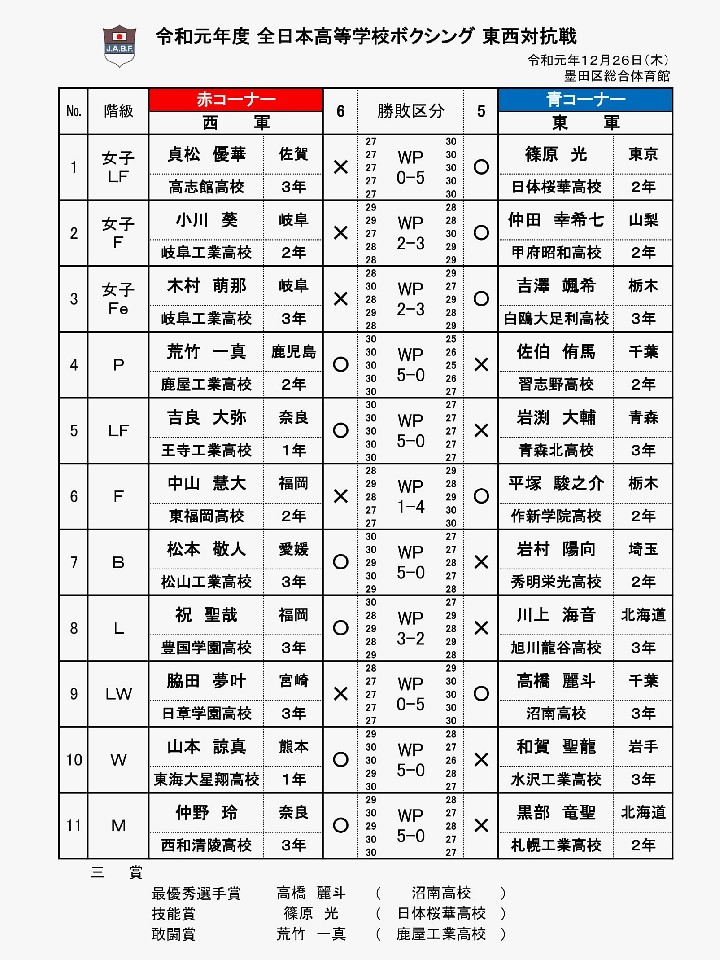 12月26日、東京の墨田区総合体育館で行われた“全試合チャンピオン対決”で復活した『全日本高校東西対抗戦』は、男女11階級の激突により、6対5で西軍の勝利に終わった。最優秀選手賞は男子ライトウェルター級の高橋麗斗(千葉=沼南高校)、技能賞は女子ライトフライ級の篠原光(東京=日体桜華高校)、敢闘賞は男子ピン級の荒竹一真(鹿児島=鹿屋工業高校)が受賞。偶然ながら、今年はプロボクシングの全日本新人王戦でも、西軍が6勝5敗1分で勝ち越す結果で一致している。