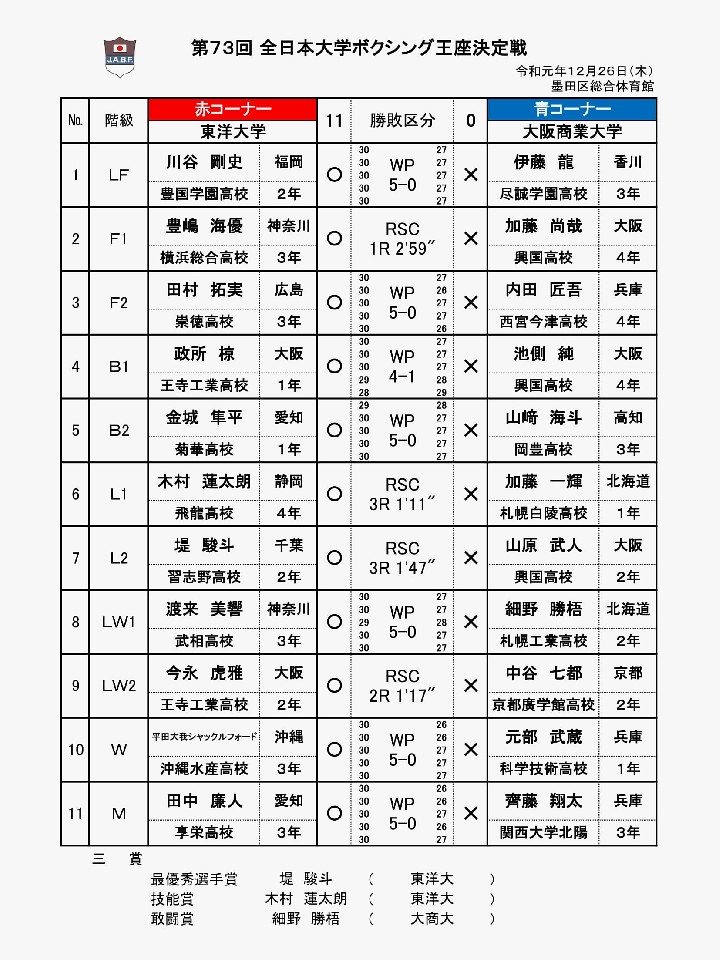 12月26日、東京の墨田区総合体育館で行われた“全試合チャンピオン対決”のラスト、第73回全日本大学王座決定戦では、今季の関東大学リーグ戦で初優勝を収めた東洋大学が、関西学生リーグ戦で5年ぶりの優勝を収めた大阪商業大学に11対0で完封勝利。同校初の大学日本一に輝いた。プロボクシングの現役世界王者では東洋大が村田諒太(帝拳=WBA世界ミドル級)の母校、大阪商業大学が京口紘人(ワタナベ=IBF世界ライトフライ級)の母校でもある。