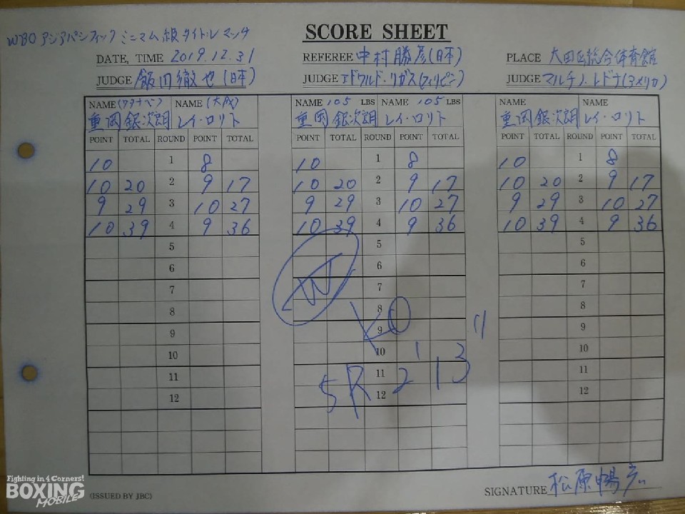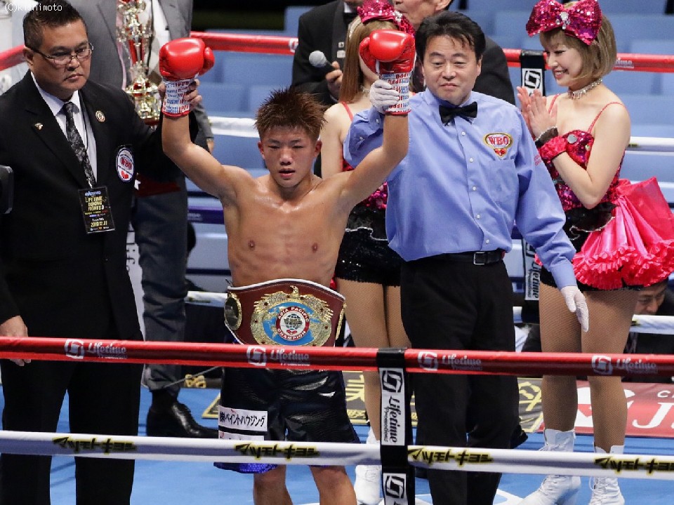 「今までは相手のレベルが低いと言われていたけど、今回は強い相手と言われてたので試合を観ていない人には、5ラウンドKOということだけ伝えたいですね」と笑顔で始めた試合後の囲み取材。「3ラウンド目のワンツーは効いた。熊本の試合でも同じような感じでパンチが効いた場面はあったけど、今回のほうが強くて、しばらく頭がぼーっとしていて。足を使った方が打たせずに着実に取れると途中で気づいて切り替えた。2ラウンド目に鼓膜が破けて、拳も頭に当たった時に痛め、12ラウンドやっていたら、どうなるか分からなかったので倒せてよかった。相手は綺麗にワンツーを決めても効いた素振りがなかった。とにかく(パンチを)もらいすぎた」と反省の弁が口をついた。「こんな勝ち方でしたけど、来年中には世界王座に挑戦できると思う。最短記録にこだわりはないけど、早く獲れるに越したことがないと思っているので、日本でも海外でも誰とでも戦いたい。年が明けたら1月13日が成人式なので熊本に帰るけど、傷だらけの顔で行きたくないなあ。鼓膜が破れているので飛行機に乗っていいのか心配です」。2020年は注目を集めはじめたミニマム級の風雲児の飛躍に期待したい。