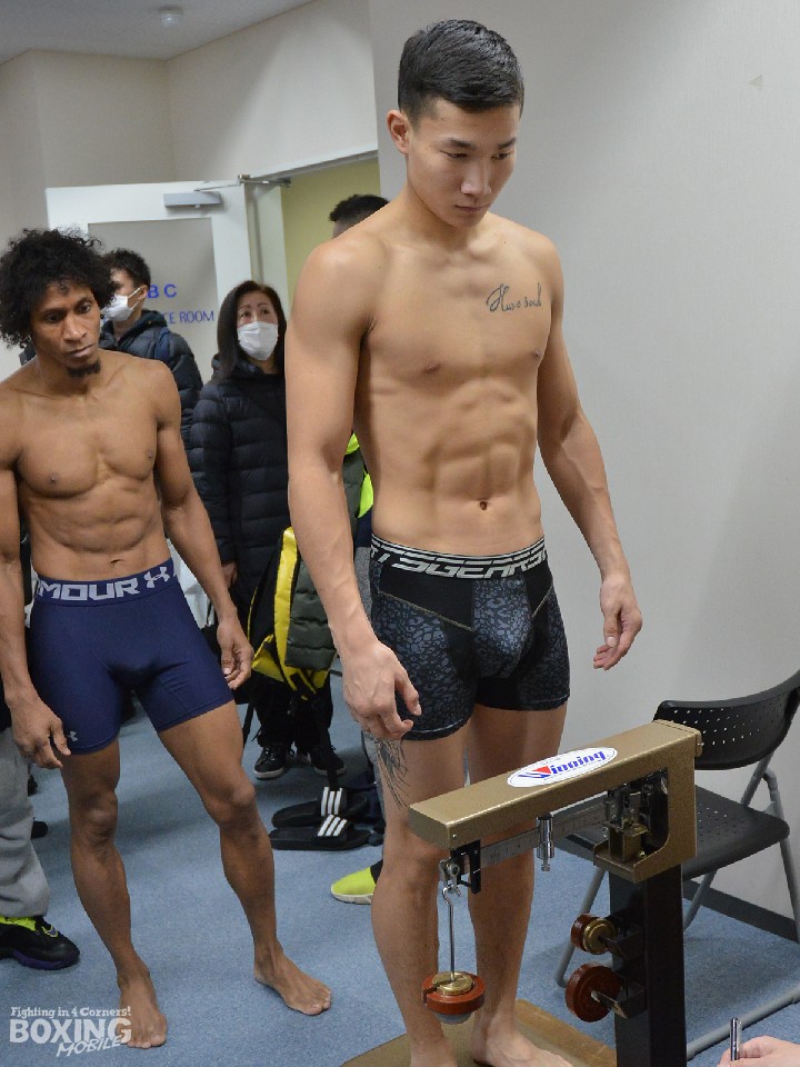 令和2年国内最初のボクシングイベント、「DANGAN232 KNOCK OUT DYNAMITE賞金マッチトーナメント決勝戦」が明日12日、後楽園ホールで開催される。その前日計量が11日に都内の日本ボクシングコミッション本部事務局で行われ、メインの65.0kg契約5回戦で拳を交える日本スーパーライト級6位デスティノ・ジャパン(35=ピューマ渡久地)とトゴルドル・バットツォグト(20=蒙)は、ともに一発でクリアした。
