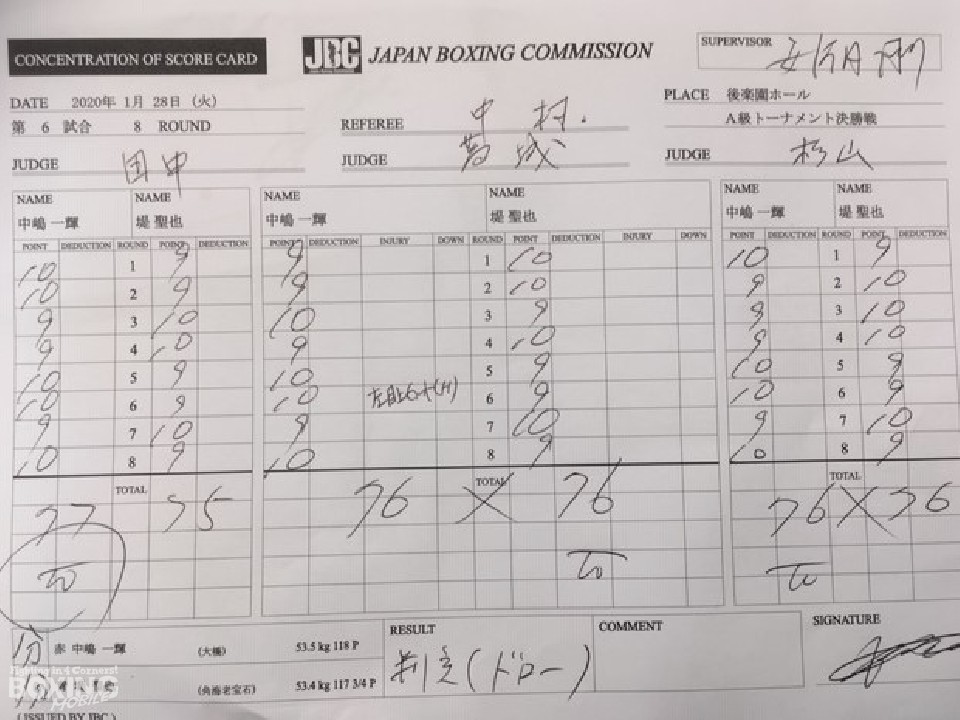 引き分け勝者扱いでバンタム級トーナメントを制した中嶋は「(採点は)ドローかなと思った。狙いすぎて力んでしまい回転の速いパンチを打つことができなかった。打つ時に重心を低くされて戦いにくかった。勝って優勝したかっただけに悔しい」と反省した。