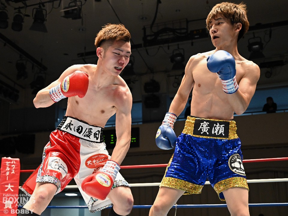 第9試合C級トーナメント決勝フェザー級4回戦では永田優司(20=船橋ドラゴン)と廣瀬佑也(21=花形)が激突。サウスポー廣瀬が伸びのある左ストレートでペースを握ると2回にコンパクトな右フックでダウンを先取。立ち上がってきた永田に右フックでキャンバスに沈めた。