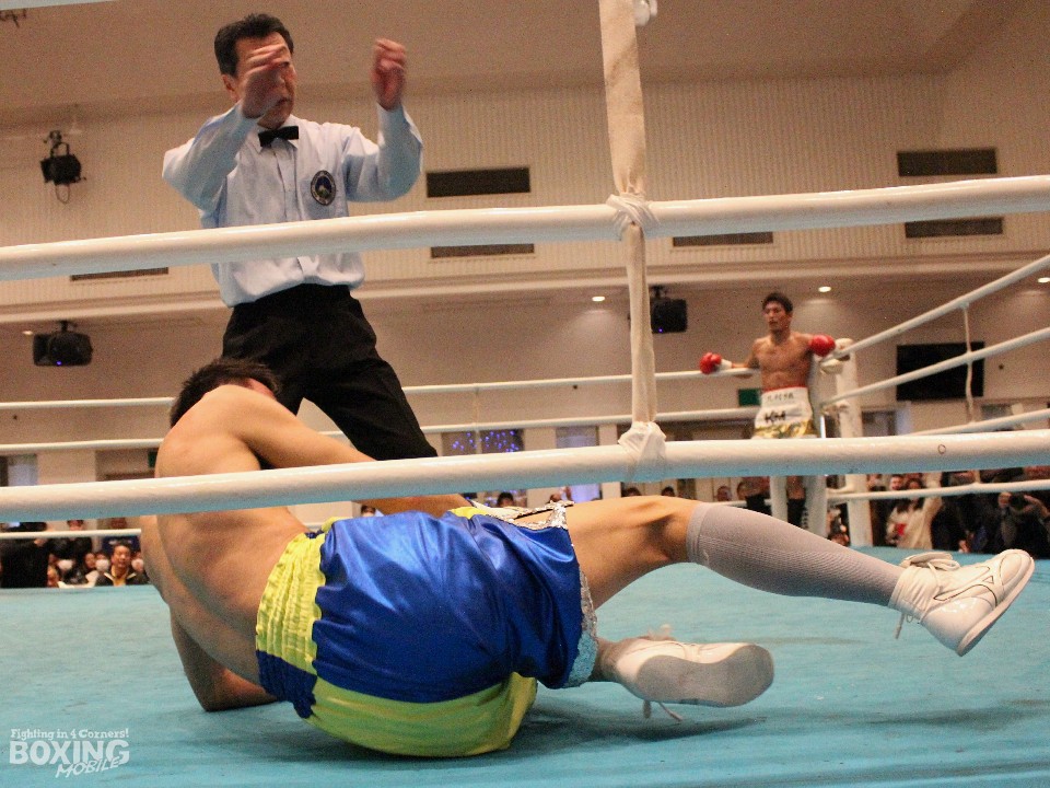 仲里が豪快なKO勝ちで沖縄のファンを魅了した。サウスポー粟田が左ストレートを決めるが、仲里は冷静に対処すると鋭い踏み込みから右ストレートを痛打。ペースを握ると4回に右ストレートでキャンバスに沈めた。