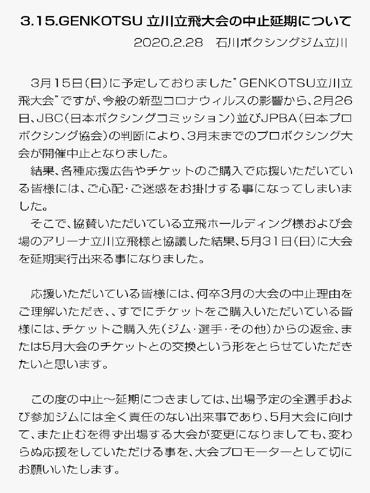 石川ボクシングジム立川が29日、3月15日(日)に予定していた「GENKOTSU 立川立飛大会」を5月31日(日)に延期することを発表した。新型コロナウィルスの影響でJBC(日本ボクシングコミッション)と日本プロボクシング協会が3月1日から3月31日までのボクシングイベントを全て中止することを決定してから、大会の延期が正式に発表されたのは今回が初めて。なお、3月15日のチケット購入者は、購入先(ジム・選手・その他)からの払い戻し、または5月31日のチケットとの交換ができる。
