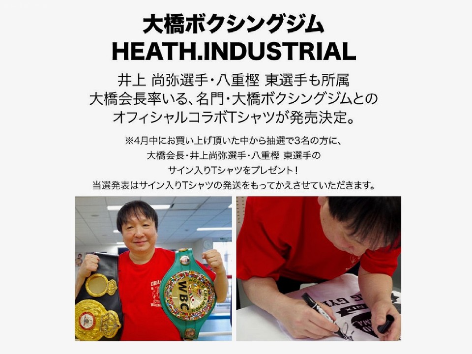大橋ジムが横浜市のアメカジショップ「HEATH.INDUSTRIAL」とコラボした大橋ボクシングTシャツを1日から発売している。TシャツはS〜XXLの5種類あり4200円(税込み)。「HEATH.INDUSTRIAL」はプロ野球の横浜ベイスターズとコラボしたグッズなども発売している。