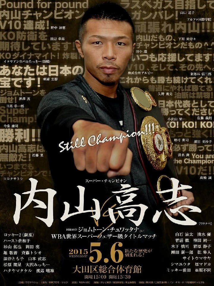 2015年の今日(5月6日)、当時WBA世界スーパーフェザー級スーパーチャンピオンの内山高志氏がムエタイの絶対王者ジョムトーン・チューワッタナ(タイ)を大田区総合体育館に迎えて10度目の防衛戦に臨んだ日。緊張感が高まる中で行われた試合は、に2R 1分 15秒 "バッーン"という凄まじい破壊音で終わった。試合後の会見では涼しい顔をしていた「KOダイナマイト」も帰り際には「緊張?しましたよ」とホッとした表情を見せた。ボクシングのチャンピオンとして負けるわけにはいかなかった。「みんなが心配してたのが伝わってきてた」と、笑ったのをよく覚えている。