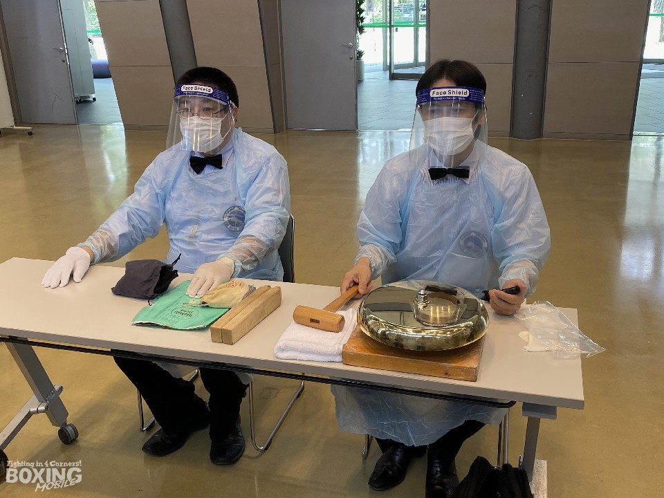 リングサイドの関係者はマスクとフェースシールドと手袋を着用