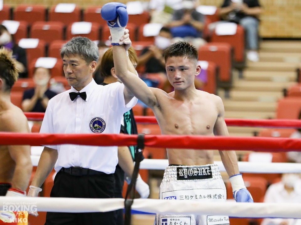 那須の右カウンターが勝利を呼び込んだ!初回、突っ込んでくる徳山に右ストレートを合わせてダウンを奪うと、2回にも右カウンターで倒した。ポイントを挽回したい徳山は押し込み左右フックを繰り出すが、那須も引かずにパンチを返し試合終了のゴングを聞いた。