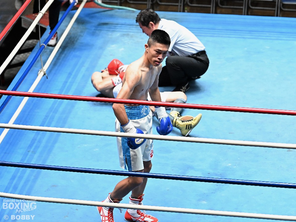 第8試合では阿部愛斗(19=石神井スポーツ)が大森建太郎(35=イマオカ)に初回17秒でKO勝ちし会場に衝撃を与えた。