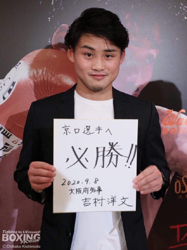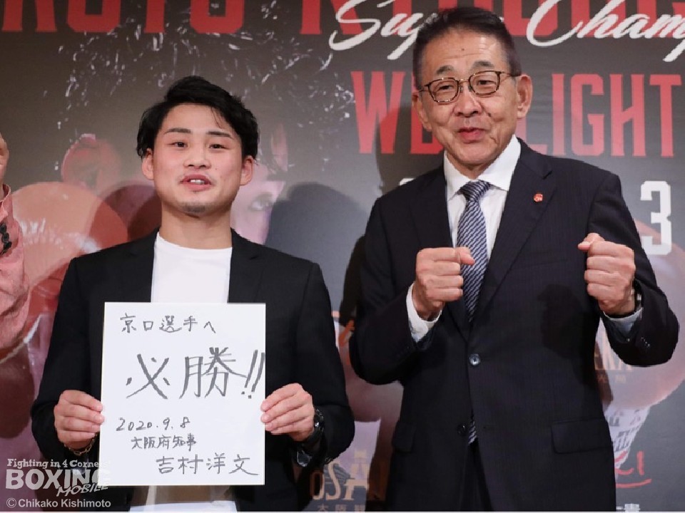 昨年10月以来の試合となる京口は、前戦に続き地元・大阪のリングに上がる。会見前には大阪府庁へ行き、大阪府の吉村洋文知事を表敬訪問。吉村氏から激励を受けて「必勝」と書かれた色紙をプレゼントされた。