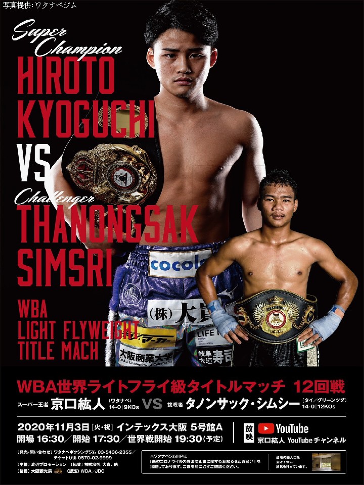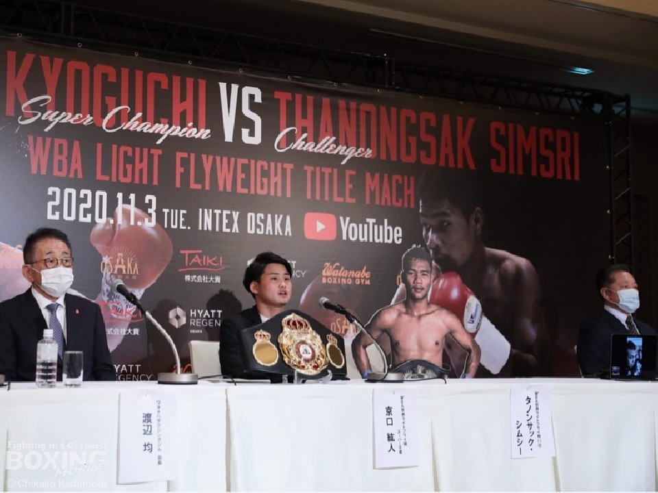 ワタナベボクシングジムは8日、大阪・住之江区のハイアットリージェンシー大阪で会見を開き、WBA(世界ボクシング協会)ライトフライ級スーパー王者の京口紘人(26=ワタナベ)の次戦を発表した。京口は、11月3日(火・祝)にインテックス大阪で同級11位のタノンサック・シムシー(20=タイ)を迎えて3度目の防衛戦を行う。