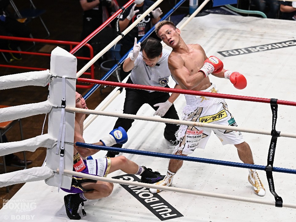 中嶋が上位ランカーの力を示した。序盤は、長身の野村がボディにパンチを集めて奮闘。しかし、サウスポー中嶋は3回になるとプレスを強めて、左ボディアッパーで動きを止めて右フックでダウンを演出。再開後に左ボディからパンチをまとめてフィニッシュした。