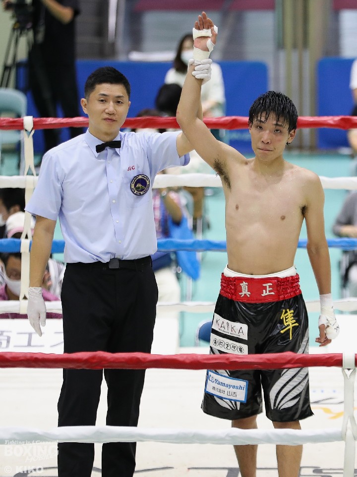 サウスポー久保が巧みなゲームメイクで五十嵐の攻撃を捌き切った。久保は初回からジャブでプレスをかけると左ストレートをヒット。五十嵐のボディ攻撃にも冷静に対応し的確なパンチでポイントを加点。中差判定勝ちで再起に成功した。