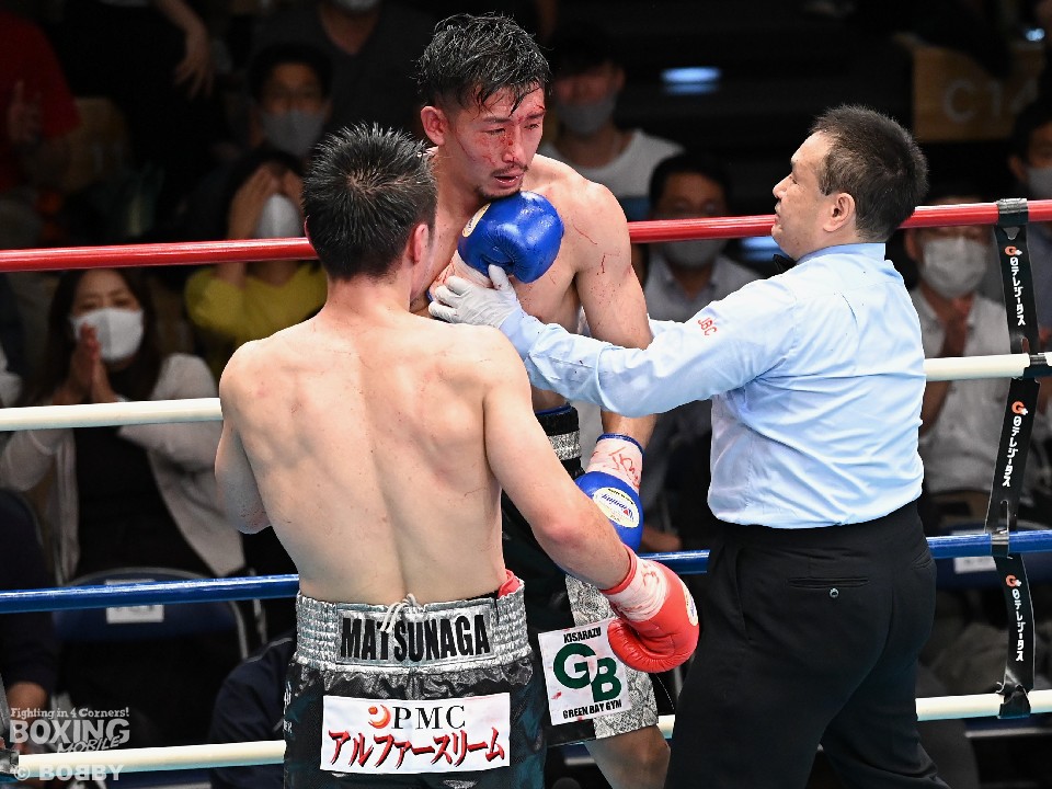 サウスポー松永は慎重な試合運びを見せていたが、3回にギアを上げて右フックをヒットしペースを掌握。清水はシャープな右から切り込むが、松永は距離を詰めてワンツーを好打。松永はパンチを浴びて鼻を負傷したが、プレスをかけて攻め立てた。5回終了時の公開採点は50-45、49-46、48-47で松永がリード。勝負が決まったのは7回。松永は上下に打ち分けダメージを与えると左目上を切り裂き、最後は右フックでレフェリーストップに持ち込んだ。