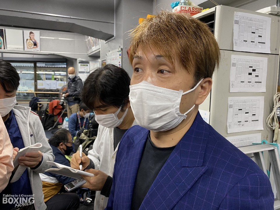 本石会長は「コロナ禍の中で京口選手がどのような覚悟を持っているのか、意気込みや気迫を見に来た。『強い』の一言。調整もぬかりなく今日は見に来て良かった」と話すと、「彼の左アッパーと左ボディは脅威。大きな武器だが弱点でもある。対策は十分している」とタノンサックのベルト奪取に全力を注ぐ。