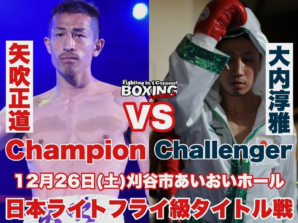 ライトフライ級チャンピオン矢吹正道(緑)に挑む大内淳雅(姫路木下) が8位から1位にジャンプアップ。試合は12月26日(土)刈谷市あいおいホールで開催される。