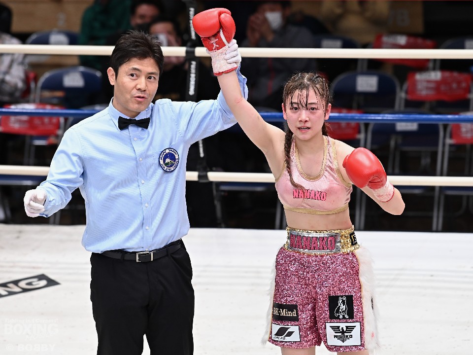 日本女子フライ級3位の鈴木なな子(21=三迫)が10日、同ミニフライ級6位の細田めぐみ(38=SRS)とミニマム級のリングで対戦した。両選手ともに今回が初の6回戦。試合は初回に右ストレートをヒットした鈴木が4回に左フックを好打した細田との打ち合いを制して判定勝利を挙げた。