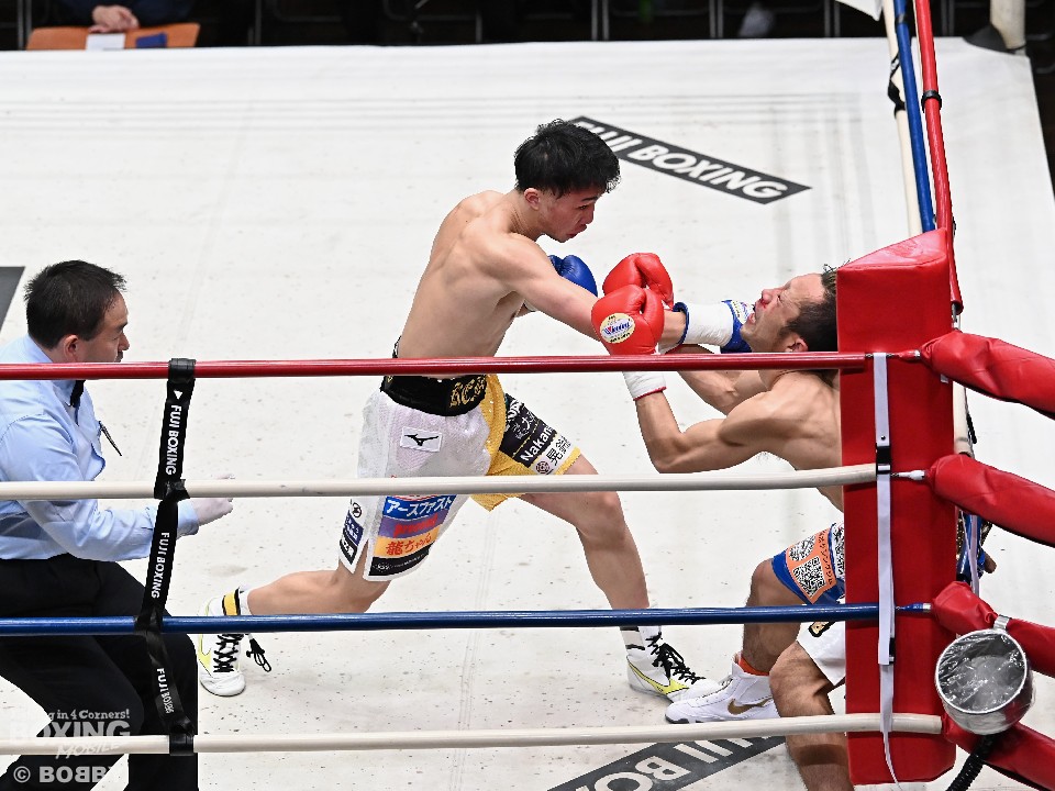 サウスポー中垣は右で距離を測ると、飛び込んでくる興法にカウンターを合わせて対応。4回に左ストレートで腰を沈めさせるとコーナーに詰めてボディへの連打で攻勢。最後は右ボディを突き刺しキャンバスに沈めた。