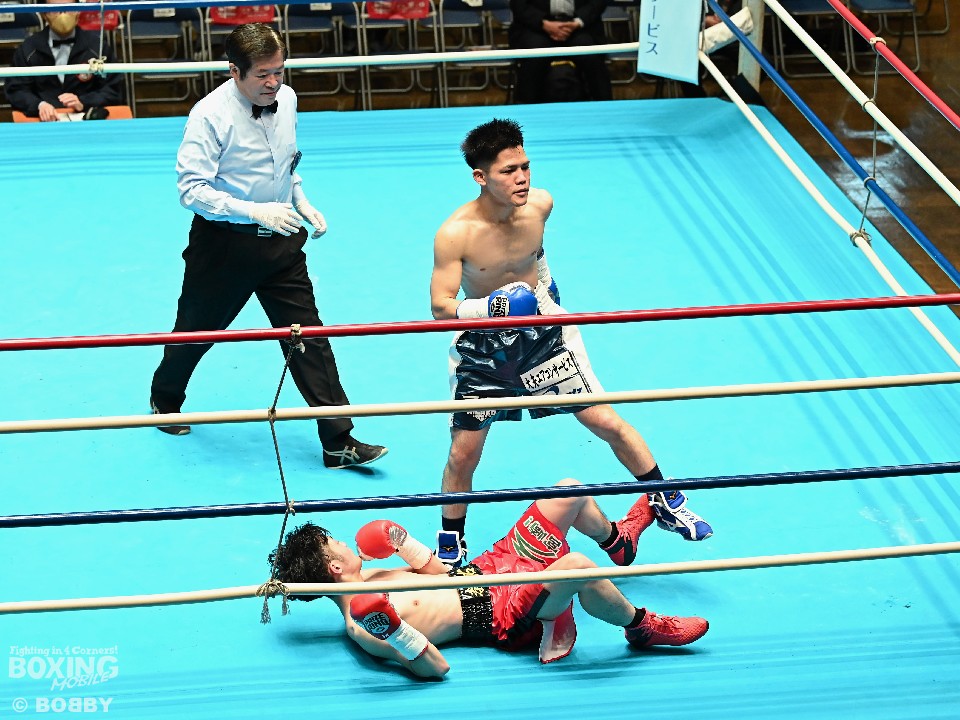 川満の強打が火を噴いた!初回、川満はジリジリと距離を詰めると右フックを直撃!大の字になった安藤を見てレフェリーはノーカウントで試合をストップした。