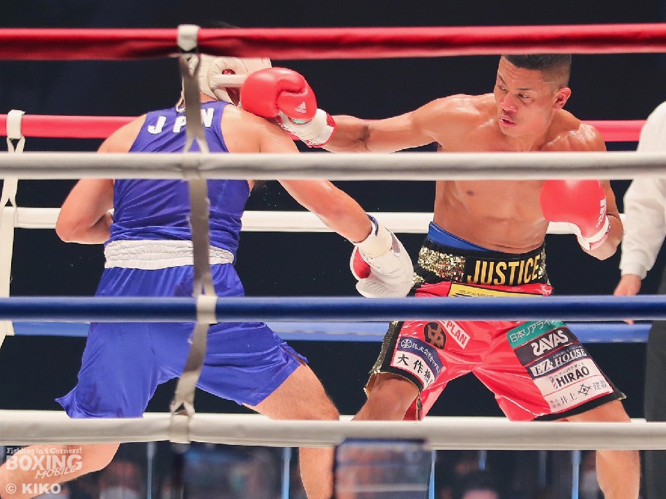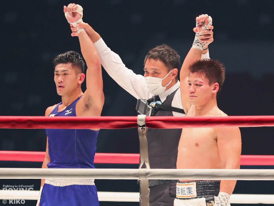 対戦が発表されるやいなやSNS上でも”筆戦”が繰り広げられた東京オリンピック日本代表の岡澤セオン(鹿児島県体育協会)と日本ユースチャンピオン佐々木尽(八王子中屋)の対決は力が入った。魅せるボクシングを意識した両雄。大袈裟なパフォーマンスでプレッシャーをかけて顔面を狙う佐々木にセオンは両手を後ろに回して挑発。技術とパワーが交差した。