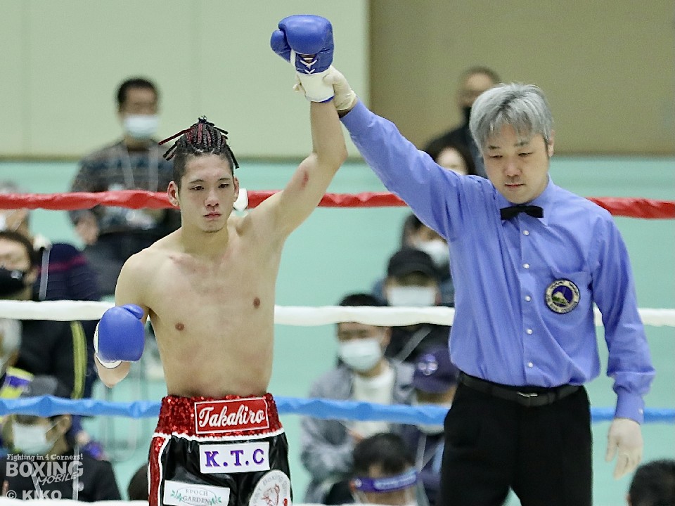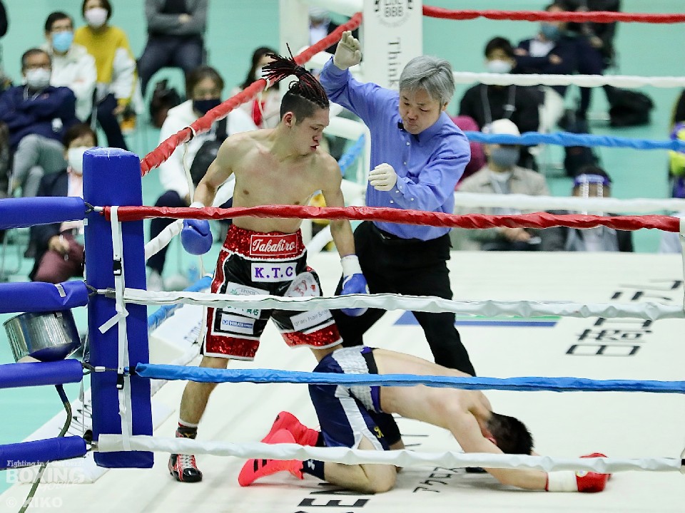 スイッチヒッターの田井が豪快に倒して会場にインパクトを与えた。序盤から田井は、左右にチェンジしながらトリッキーな動きで相手を翻弄。左ストレート、右ロングフックを叩きつけて先制攻撃を仕掛けた。脇田は、ジャブからワンツーを打ち込むが、田井は反応の良さを見せて被弾を回避した。4回、田井はサウスポースタイルからの左ボディアッパーで動きを止めると、最後も左ボディアッパーをめり込ませてキャンバスに沈めた。