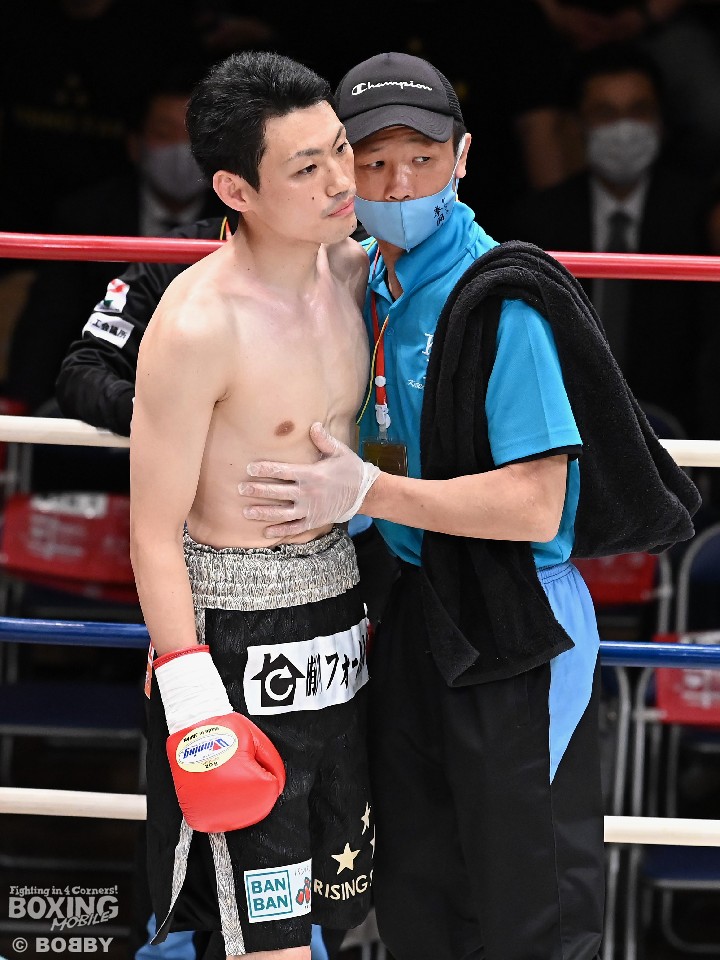 試合後に囲み取材に応じた日野は「5ラウンドくらいから効いているのがわかったが、パンチを振ってきたので仕留めるまで時間がかかってしまった。ただ、焦る場面もなかったし、試合はコントロールできていたと思う」と冷静に振り返った。