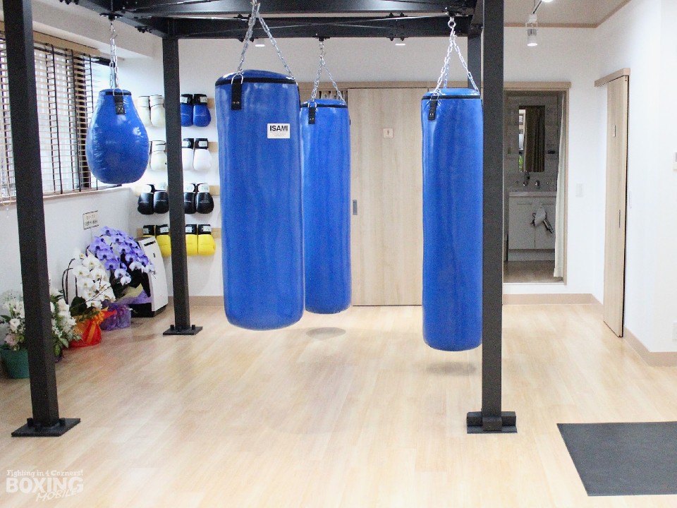 ジムは、比較的コンパクトな作りでベージュを基調とし清潔感を感じさせる。サンドバッグは青色で統一されている。