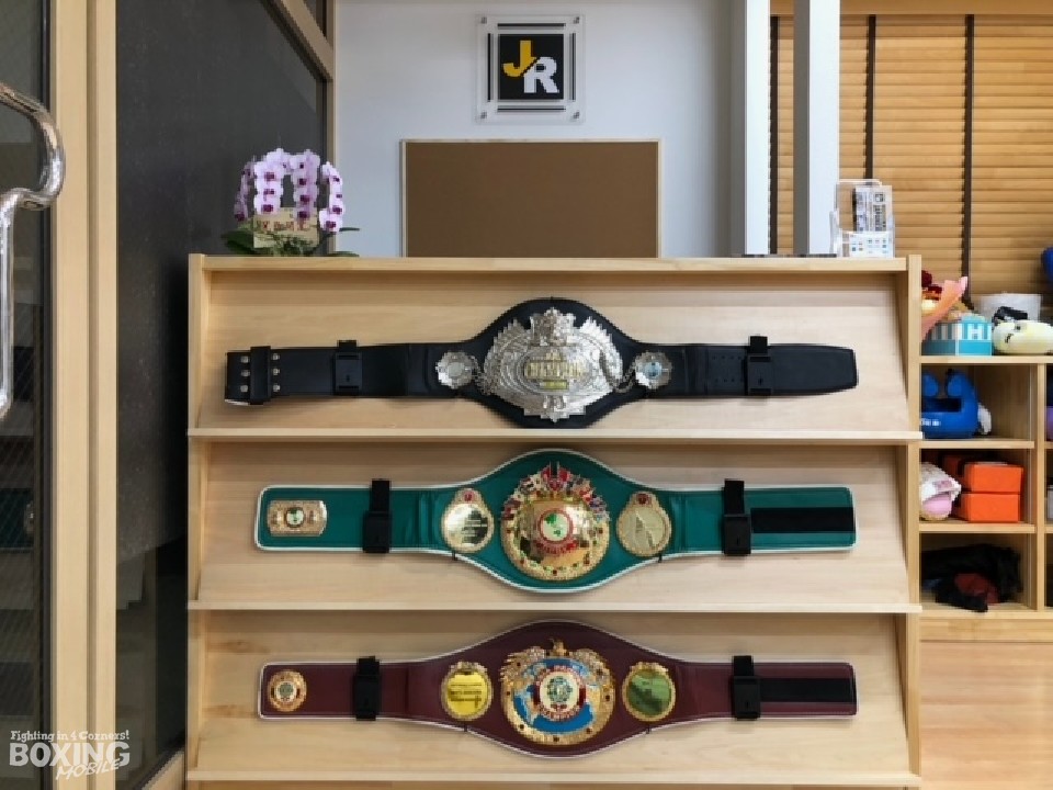 入口には荒川氏が獲得した数々のベルトが飾られていて触ることができる。