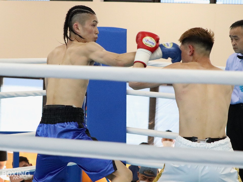 第5試合スーパーフェザー級4回戦では、田中太将(25=博多協栄)と山名生竜(19=HKスポーツ)が拳を交えた。サウスポー山名が前の手で距離を測ると右フックでダウンを先取。2回に左ストレートで倒して3回に再び右フックでキャンバスに沈めた。