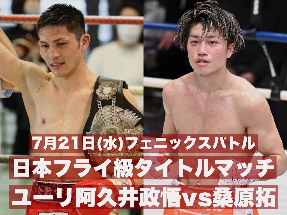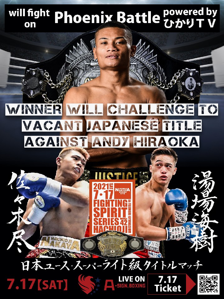 王座空位となったスーパーライト級は、ランキング2位で日本ユース王者の佐々木尽(八王子中屋)と同ライト級王者の湯場海樹(都城レオ)が佐々木のベルトを懸けて対決する。7月17日(土)八王子市富士森体育館にて開催されるこの試合は、A-SIGNでライブ配信される。お見逃しなく。この試合の勝者は、ランキング1位の平岡アンディ(大橋)と9月9日(木)に後楽園ホールで対戦する。