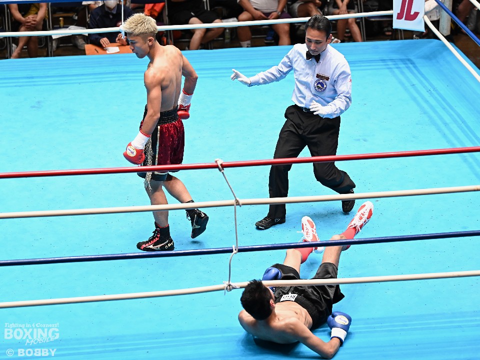 開始からキレのあるパンチで攻め立てると右ストレートでグラつかせて左右をまとめてダウンを先取。レフェリーはノーカウントで試合をストップした。大久が、初回わずか50秒で試合を終わらせた。