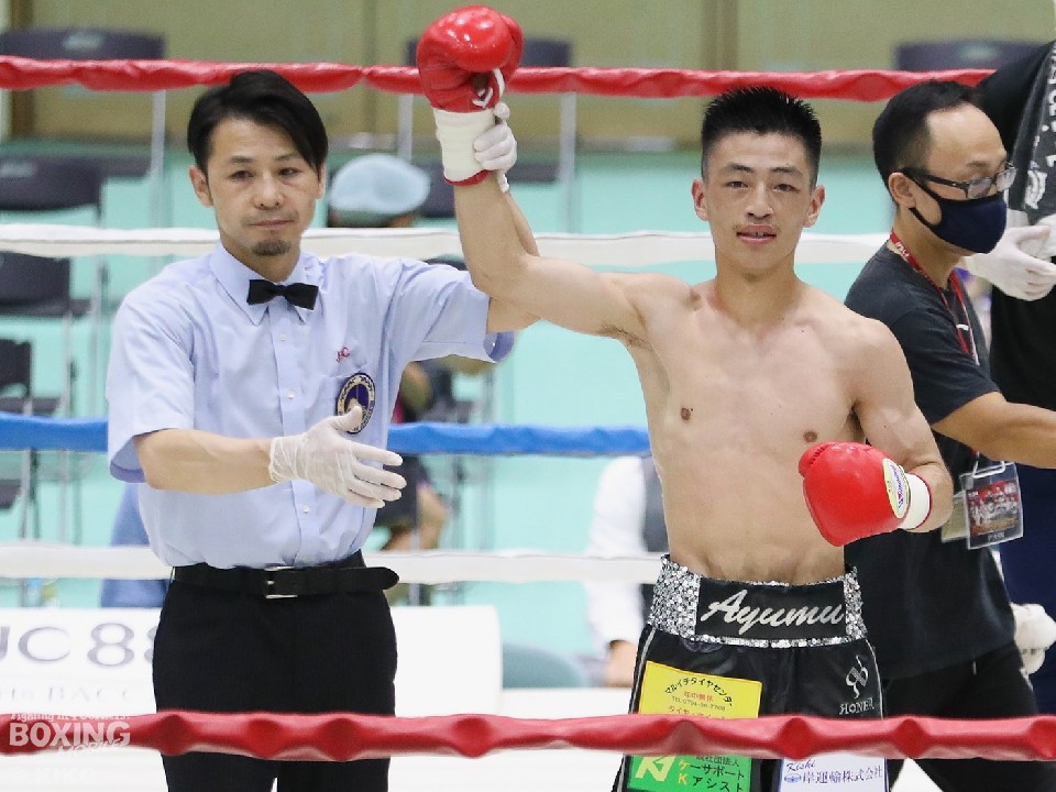 サウスポー大橋がサイドに回り込んでワンツーで顔を弾くが、青山もボディにパンチを集めて対抗。しかし、大橋はテンポの良い攻撃でポイントをピックアップしていった。動きを止めたい青山は左ボディを突き刺すが、大橋は手数を増やしてペースを渡さず。大橋が大差判定勝ちした。