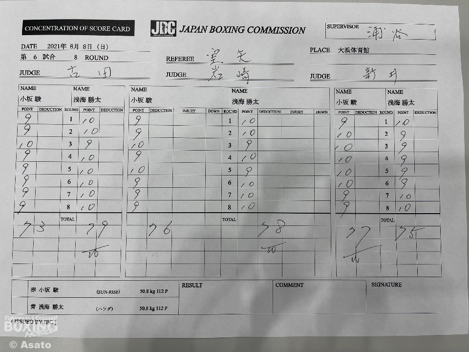 浅海は序盤から積極的にジャブ、ワンツーで前に出る。先手を取られた小坂はサークリングしながらジャブを多用し左ボディ、右ストレート、入り側に右アッパーを好打。前に出る浅海の攻撃をステップとボディーワークで交わして主導権を取り戻そうとした。しかしジリジリと前に出る浅海はポジションを変えてワンツー、終盤には右ストレートで顔を弾き、攻撃の手を緩めずに前に出てポイントを加点。判定は割れたが、浅海を支持。日本ランカーを撃破し、殊勲の一勝を勝ち取った。
