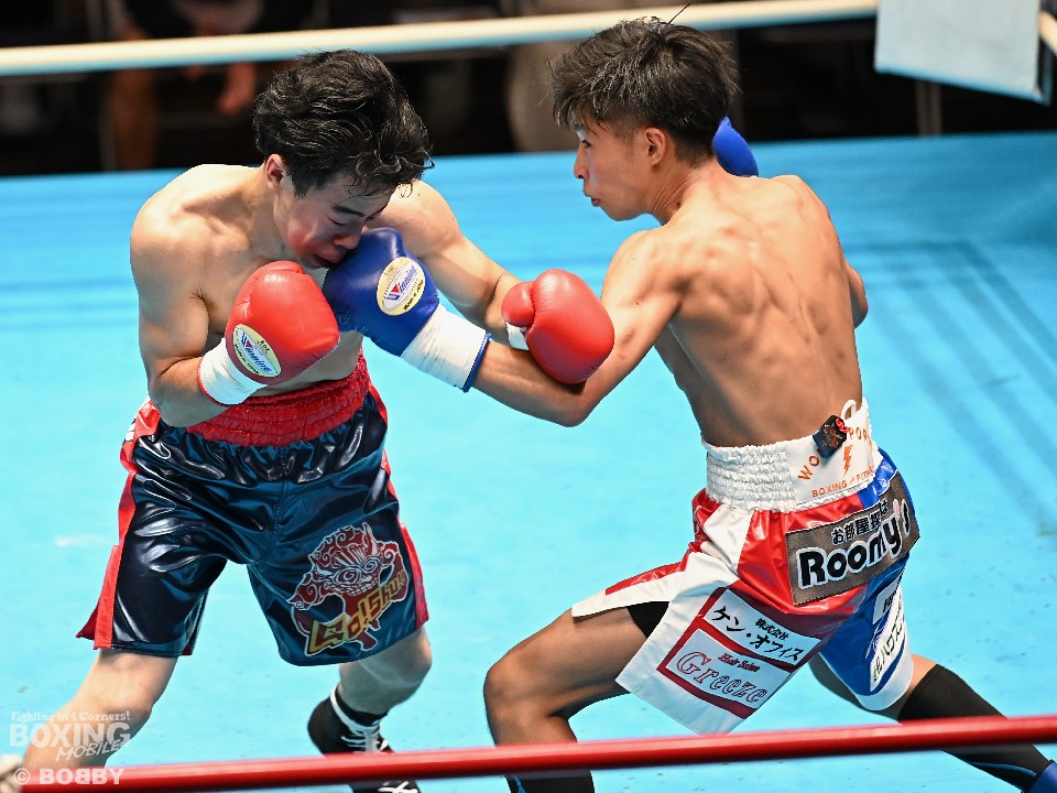 ライトフライ級4回戦では縄井愁(23=ワタナベ)と坂間叶夢(18=ワールドスポーツ)が拳を交えた。開始から坂間がジャブを軸に組み立てるとワンツーから返しの左フックでダウンをゲット。2回、坂間は被弾しながらも前に出る繩井に対し、左ボディでガードを下げさせると右ストレートから連打でレフェリーストップに持ち込んだ。