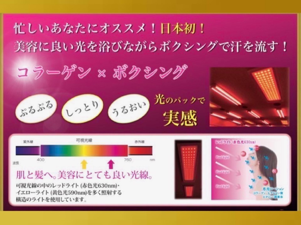 エステ業界で流行しているコラーゲンケアマシンに搭載される「コラーゲンケアライト」を直接スタジオの天井に組み込み、肌や髪の毛に良いとされている光を浴びながらトレーニングをして、汗をかいて内側からも外側からも女性をさらに綺麗にするというものだ。