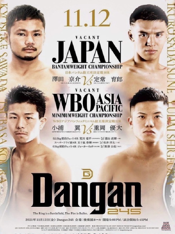 11月12日(金)に澤田京介(33=JB SPORTS)と定常育郎(24=T&T)によって、日本王座が競われるバンタム級は、日本ユース王座に就いた富施郁哉(23=ワタナベ)がランキング12位に入った。今後の活躍に期待したい。