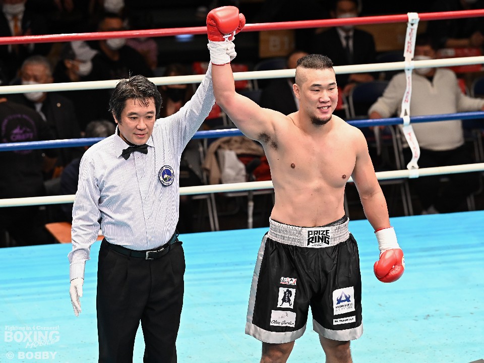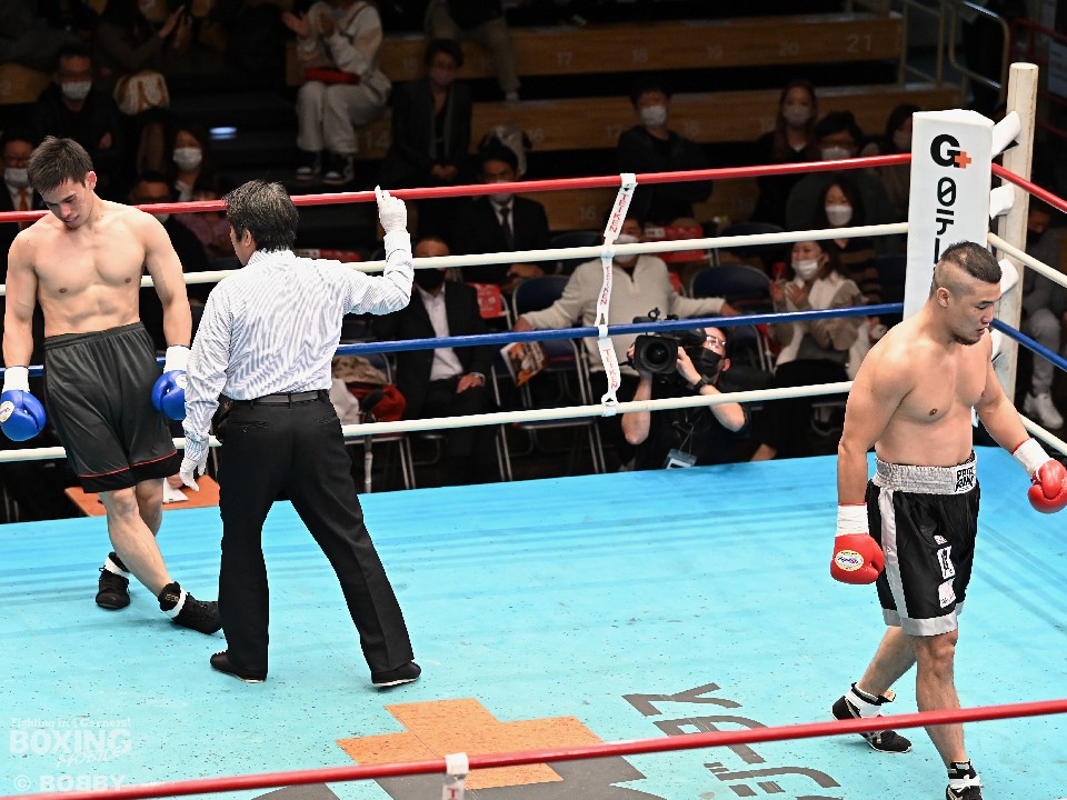 開始から力強いパンチを繰り出す中、高山が右フックでグラつかせるとロープに詰めて左右フックで痛烈なダウンを奪い勝利した。