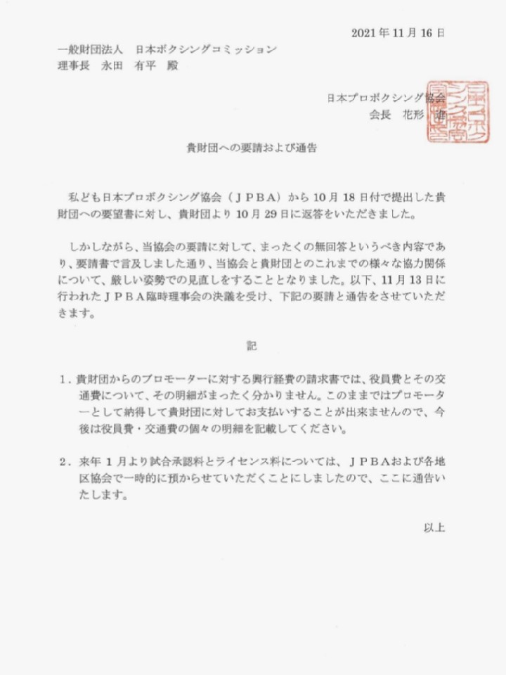 日本プロボクシング協会が16日付で、JBC(日本ボクシングコミッション)に対して要請と通達を行った件に関して、東日本協会で報告があり、今後はプロモーター委員会などを通じて対応を協議するとした。