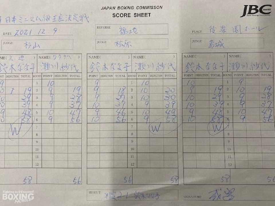 接戦を制した鈴木が新王者に輝いた。立ち上がりは、動きが硬く瀬川のワンツーを浴びた鈴木だが、2回以降はプレスをかけて上下に打ち分け反撃。足を使いながらワンツーを打ち込む瀬川に対し、鈴木は豊富な手数で攻め立てた。採点は割れたが鈴木を支持した。