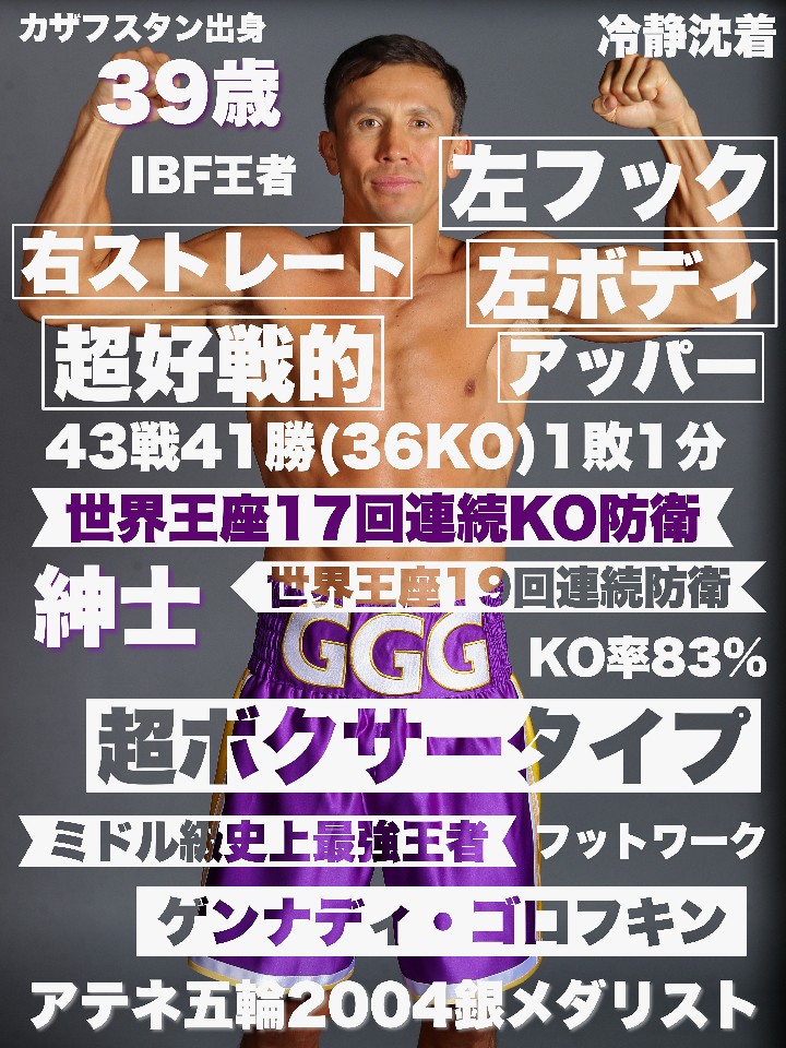 今月29日に予定されていたWBAスーパーチャンピオン村田諒太(35=帝拳)との王座統一戦は、コロナ禍の影響で延期となったが、IBFチャンピオン、ゲンナディ・ゴロフキン(39=カザフスタン)は、早期対決を望んでいる。