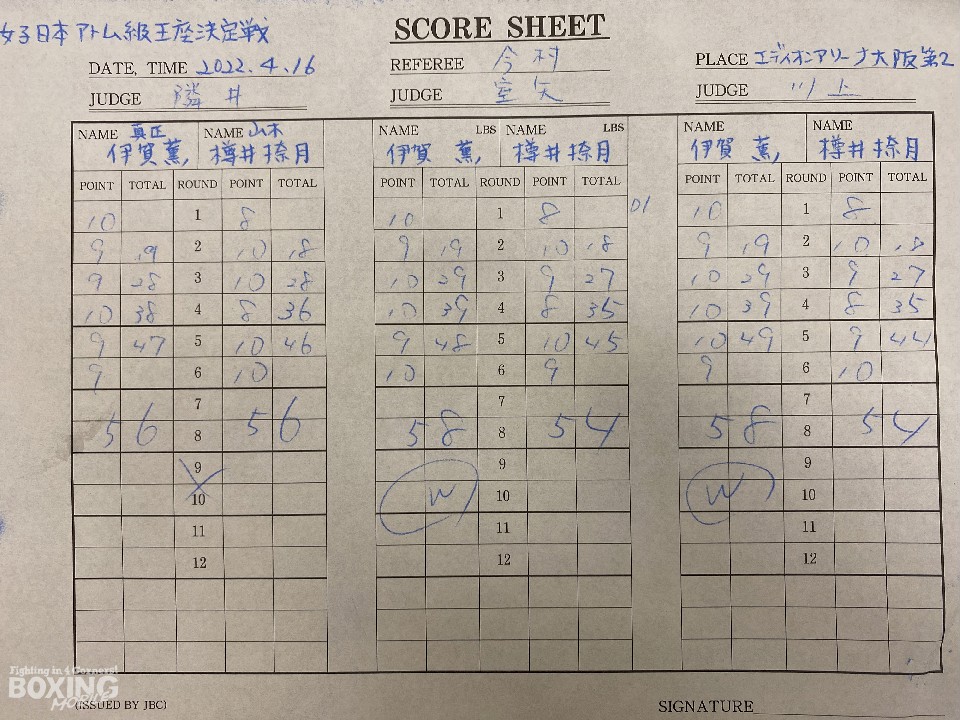 伊賀が2度目の挑戦で戴冠した。初回に右ストレートで倒すと、左右に動きながら反撃に転じる樽井に対し、4回にワンツーで2度目のダウンを演出。後半は激しいパンチの交換となるが、右ストレートが冴えわたった。