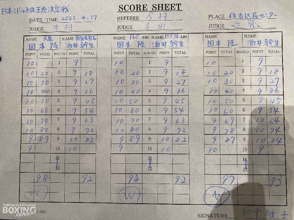 ジャブを軸に冷静に攻め立てた国本が完勝した。国本は初回から左を決めてペースを掌握。前半終了時の公開採点をフルマーク(50-45×3)で折り返すと、左ボディを織り交ぜた攻撃でダメージを与えた。右アッパーで反撃に転じた酒井だが、国本はガッチリとガードを固めて最後までプレスをかけ続けて勝利のゴールテープを切った。
